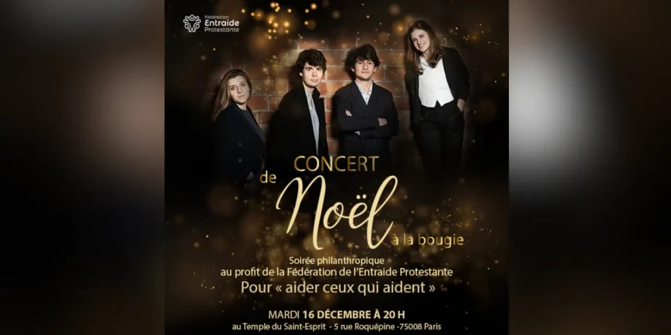 Mardi 16 décembre se tiendra un Concert de Noël à la bougie, dont le thème est “Aider ceux qui aident” et met à l’honneur ceux qui s’engagent pour les autres. Cette événement de la Fédération de l’Entraide Protestante aura lieu au Temple du Saint-Esprit.